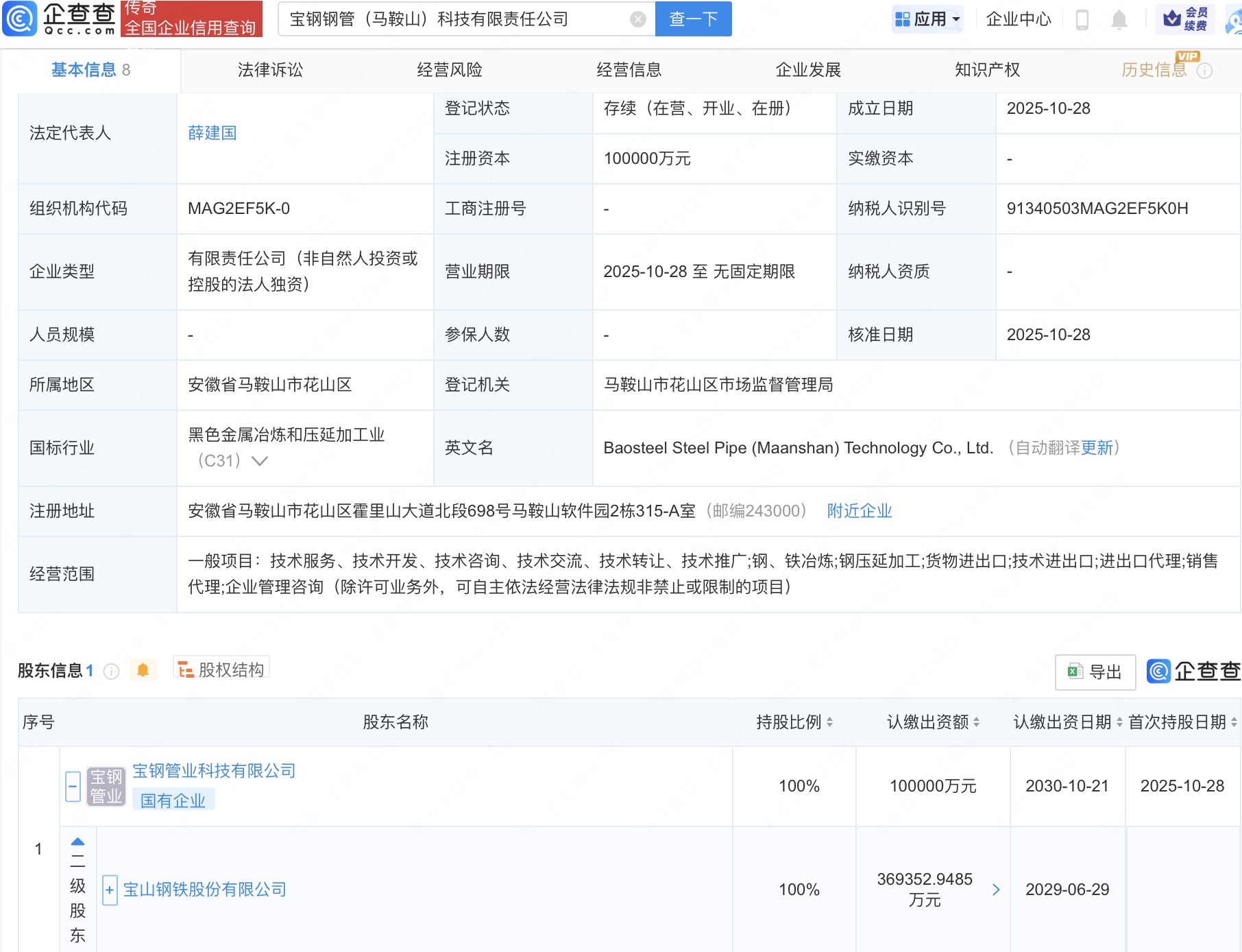 近日,宝钢钢管(马鞍山)科技有限责任公司成立,法定代表人为薛建国,注册资本10亿人民币,经营范围包括钢、铁冶炼,钢压延加工,货物进出口等。企查查股权穿透显示,该公司由宝钢管业科技有限公司全资持股,后者为宝钢股份(600019)全资子公司。